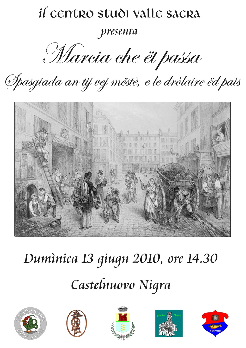 Il giorno 13 giugno 2010, dalle ore 14.30 alle ore 18.30, si svolgerà a Castelnuovo Nigra la rievocazione storica “Marcia che ët passa. Spasgiada an tij vej mëstè, e le dròlaire ëd pais”.